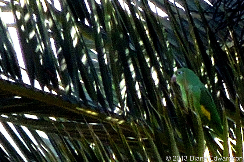 Photo: Diane Edwardson, January 18, 2013. I finally managed to capture a photo of one of the many wild parrots I regularly hear flying through the neighborhood. I literally just pointed in the direction of the really loud squawking and got lucky. (Click on photo to enlarge.)