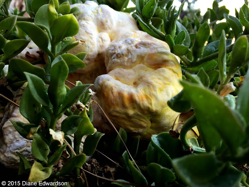 According to Mykoweb, Chicken of the Woods is unlikely to be mistaken for another species. The showy fungus does vary in its shade of yellow from year to year and even throughout its several week life span. The large mushroom is generally more scenic than just a lump hiding in the iceplant, sprouting every year from the roots of the same tree, between October and early December.